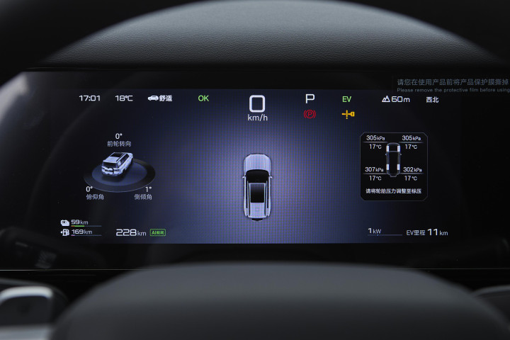 钛7采用插电混动系统,由1.5T发动机和前后双电机组成。发动机功率115kW,扭矩225N·m;电机总功率360kW,扭矩620N·m,匹配E-CVT变速箱和电动四驱,零百加速4.5秒,极速190km/h,对大块头SUV来说动力强劲。日常驾驶中,运动模式下起步加速直接,中高速动力持续充沛。但亏电时可能感觉加速乏力,与车辆状态和驾驶模式有关。电池容量35.6kWh,CLTC纯电续航190km,日常通勤3-5天一充足够。支持快充,17.5分钟从30%充至80%。60L油箱配合4.9L/100km馈电油耗,经济性出色。底盘采用前双叉臂+后多连杆悬挂,搭配云辇-C智能阻尼系统,可实时调整悬挂软硬,过滤颠簸效果好。方向盘转向轻盈精准,转弯半径仅5.67米,支持“豹式掉头”模式,狭窄路段更灵活。虽车身高大,转弯侧倾较明显,但整体操控稳定性符合中大型SUV定位。